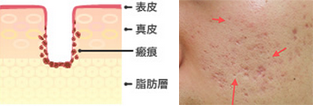 ニキビの炎症が皮膚の真皮深層まで達し、周辺の組織が破壊されると、コラーゲンの過剰修復が起こります。真皮深層にはターンオーバー機能がないため、破壊されて変形した組織はクレーター(凹み)という形で残ってしまいます。