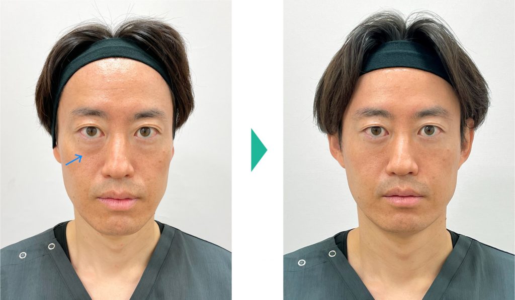 筒井院長のクマは、目の下の眼窩脂肪が幅広く突出する男性のクマに多いタイプです。年齢的に頬のたるみも同時に生じているため、脱脂のみでは頬がたるんで見えるという問題に対しては十分な改善は得られず、今ひとつの結果になってしまいます。そのため、脱脂+脂肪注入(ピュアグラフティング)を選びました。