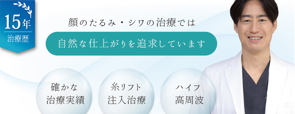 シワが深い方は、ヒアルロン酸リフトという注入治療がおすすめです。顔のたるみによるシワの場合は、糸リフトで引き上げる治療がおすすめです。